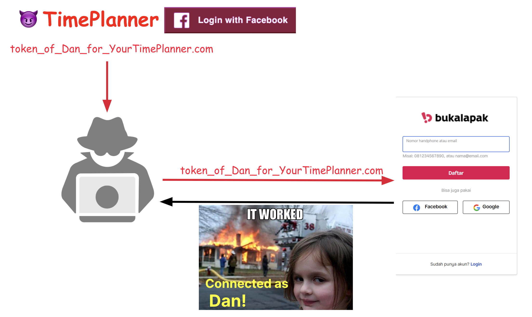 This screen shows that the attacker is connected as Dan to Bukalapak.com. Just to be clear - Dan (our victim) just connected to YourTimePlanner.com, and an attacker takes over his account on two popular websites – Vidio and Bukalapak.